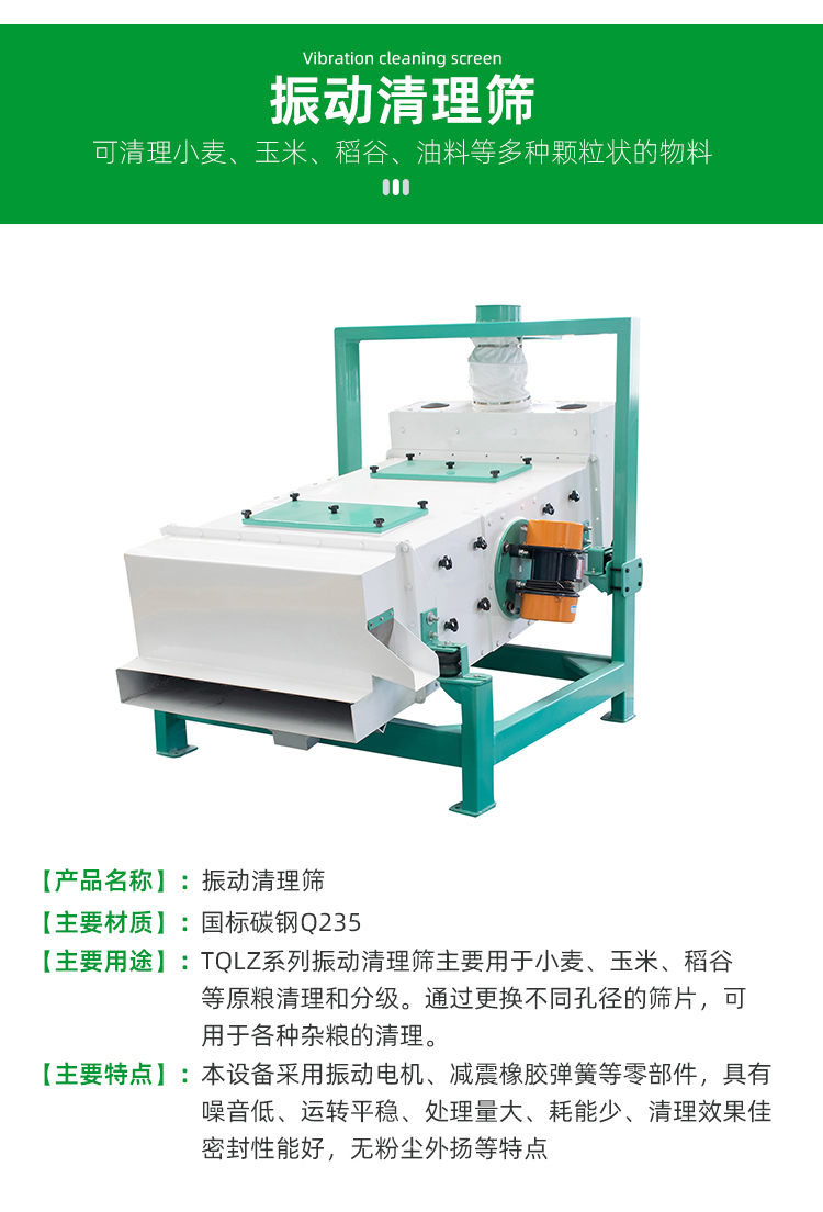 產(chǎn)品用途:TQLZ系列震動清理篩主要用于小麥、玉米、稻谷等原糧清理和分級。對糧食中的大、中、小及輕雜質(zhì)物進行篩理、分離。通過更換不同孔徑的篩片,可用于各種雜糧的清理