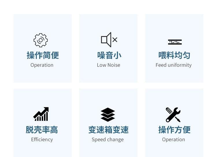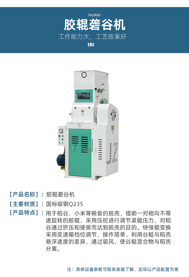 用于稻谷、小米等糧食的脫殼,借助一對相向不等速旋轉的膠輥,采用壓砣進行調節(jié)緊輥壓力,對稻谷通過擠壓和搓撕而達到脫殼的目的。快慢輥變換采用變速箱檔位調節(jié),操作簡單,利用谷糙與稻殼懸浮速度的差異,通過吸風,使谷糙混合物與稻殼分離。