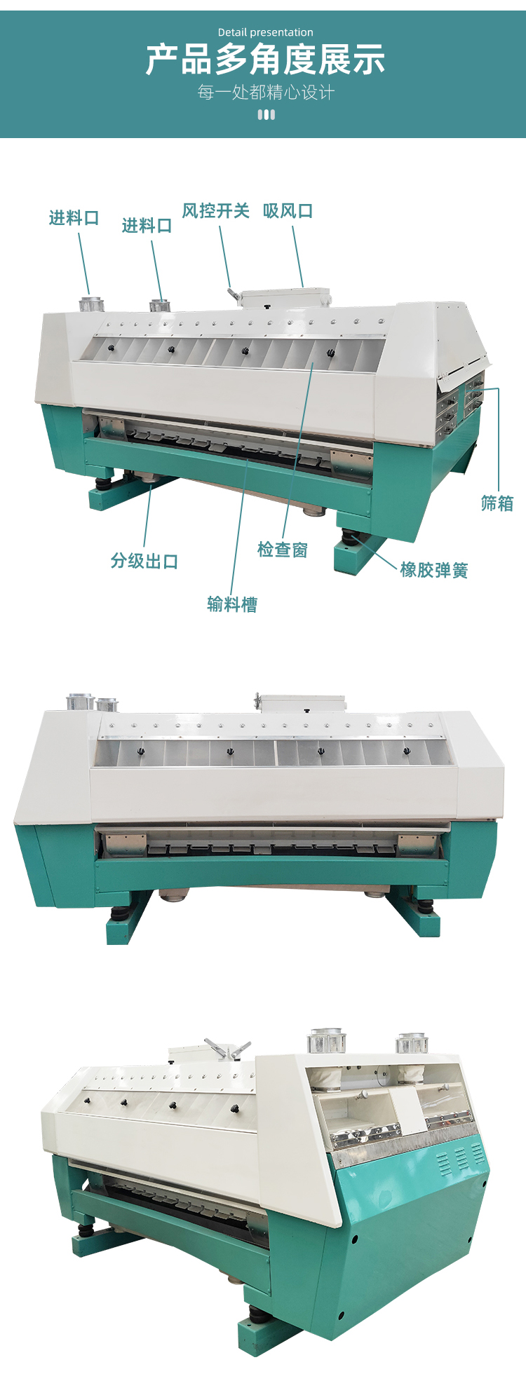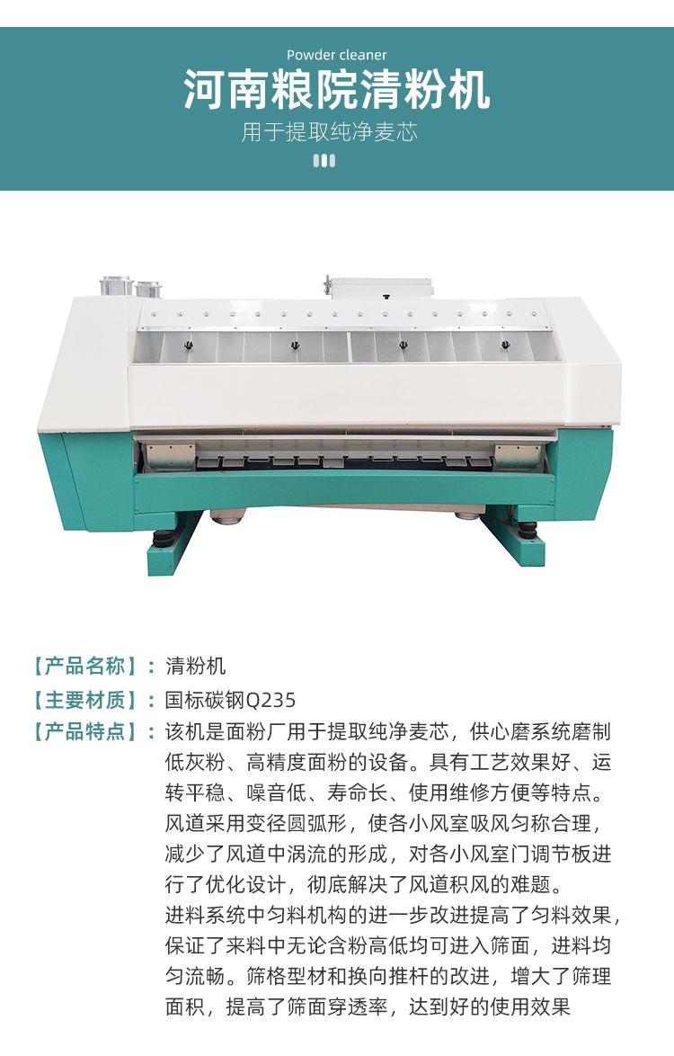 4、吸風系統(tǒng)設計先進,風道內(nèi)積存粉塵少,不堵塞,風選效果好;