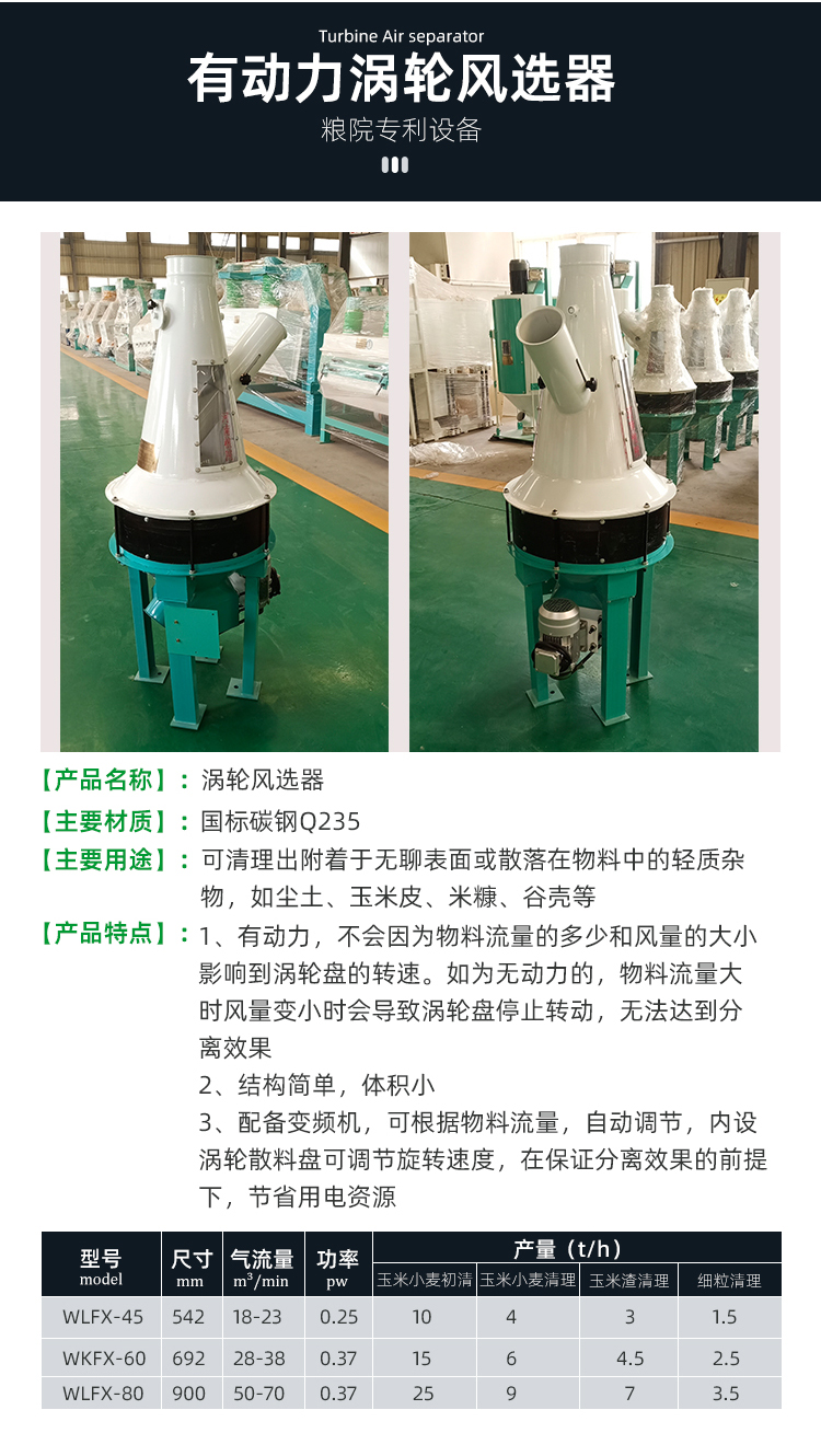 有動力渦輪風(fēng)選機是我院研發(fā)的新型皮糠分選器,運用了側(cè)口可調(diào)節(jié)進物料、上口可調(diào)節(jié)排雜質(zhì)、中部渦輪散料盤和補風(fēng)以及下料等原理。