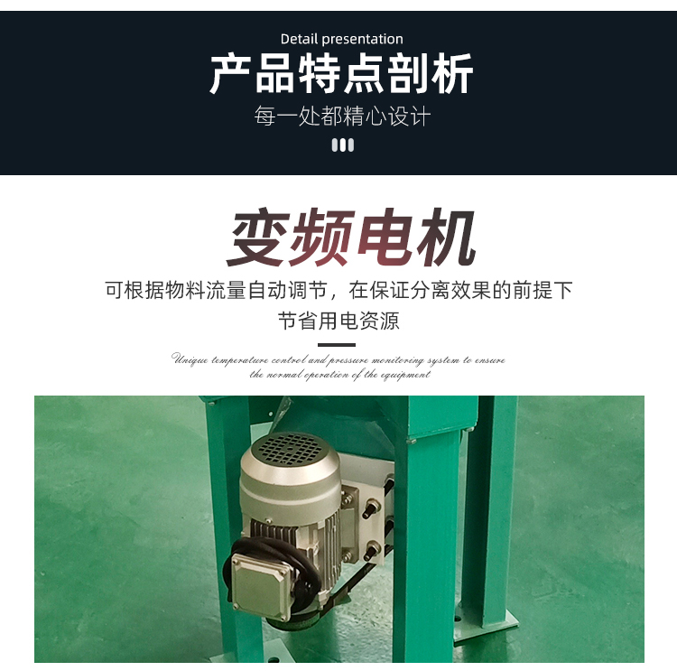 3、配備變頻電機,可根據(jù)物料流量,自動調(diào)節(jié),內(nèi)設(shè)渦輪散料盤可調(diào)節(jié)旋轉(zhuǎn)速度,在保證分離效果的前提下,節(jié)省電資源。